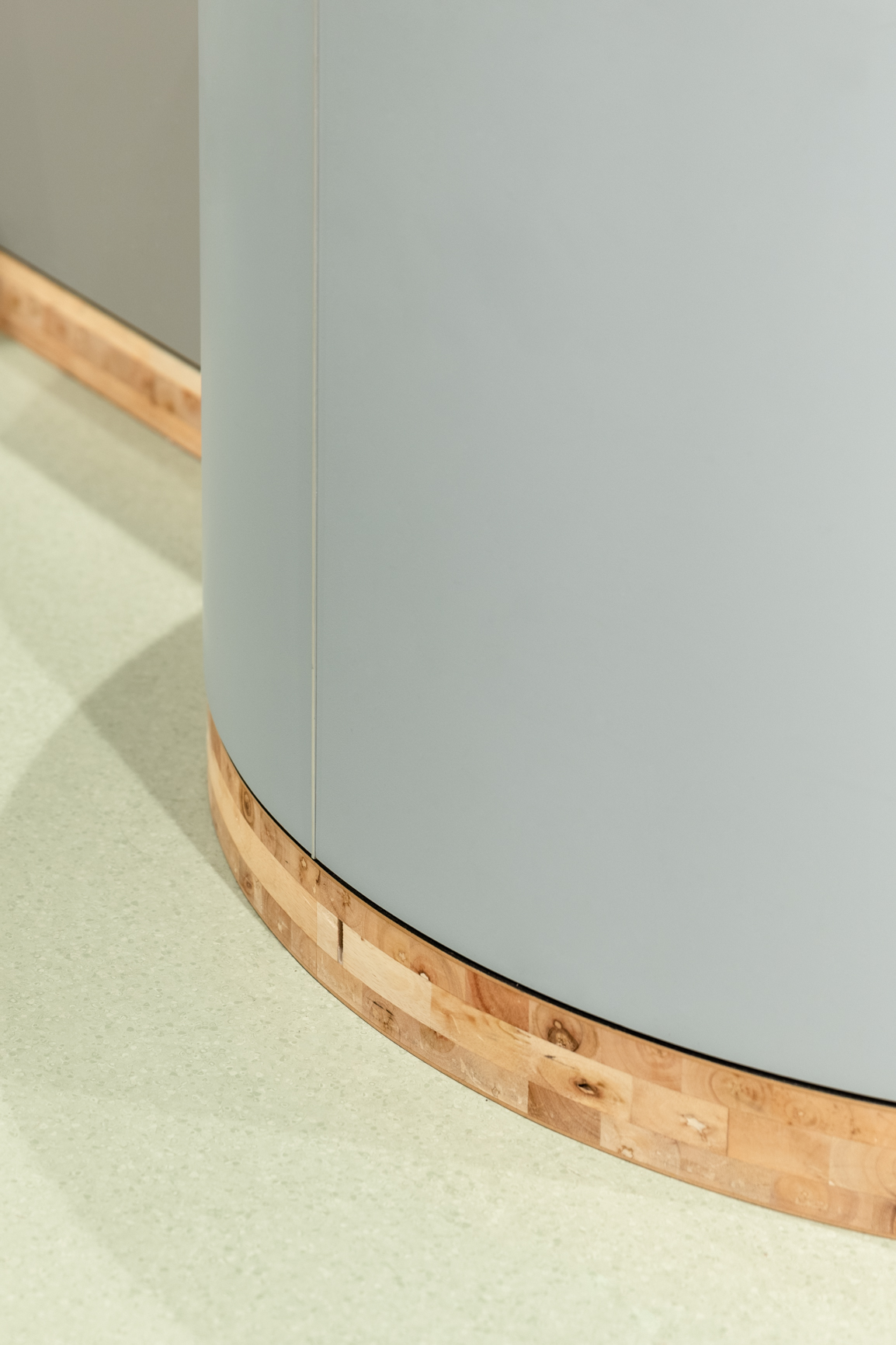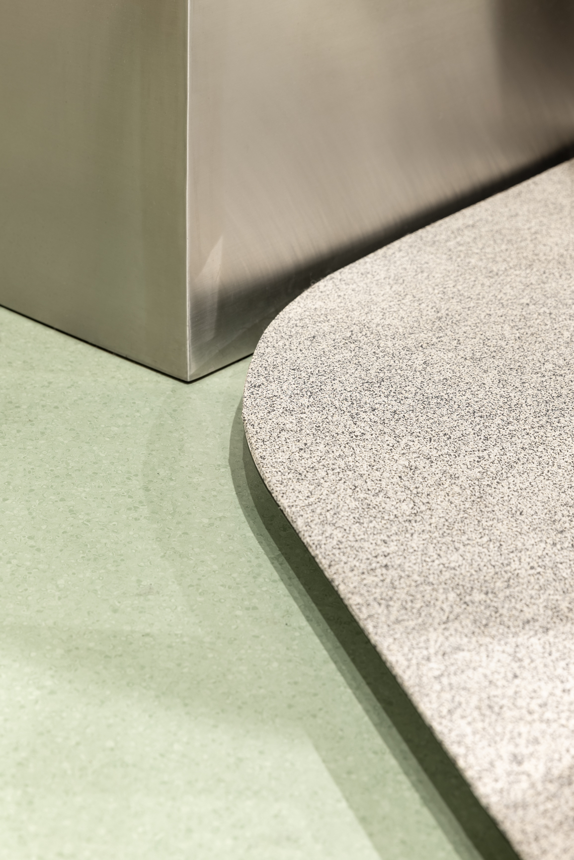 The progressive material language celebrates the rawness of concrete, marrying it with solid surface material, stainless steel, rubber, glass and the inventive use of raw poplar blockboard, softened by saturated green flooring and structured drapery.