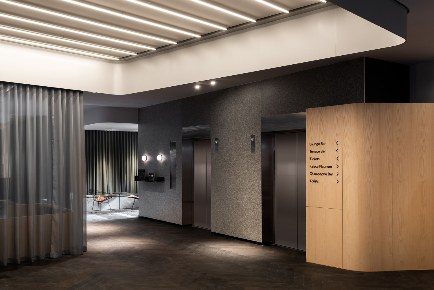 The design approach evolves the language created at Sydney’s Palace Central and creates a rich, tactile and immersive cinema experience providing a suite of different bar environments for varying occasions. The central Champagne Bar looks to restore the glamour to the movie going experience creating a confidently intimate and luxe setting, mixing saturated tones with high gloss veneer, lustrous metallics and rich upholstery. A glistening canopy of overhead lights reflects off the surrounding stainless and polished steel surfaces and defines the curved lounge area which is anchored below by low level timber veneer lined banquette seating.