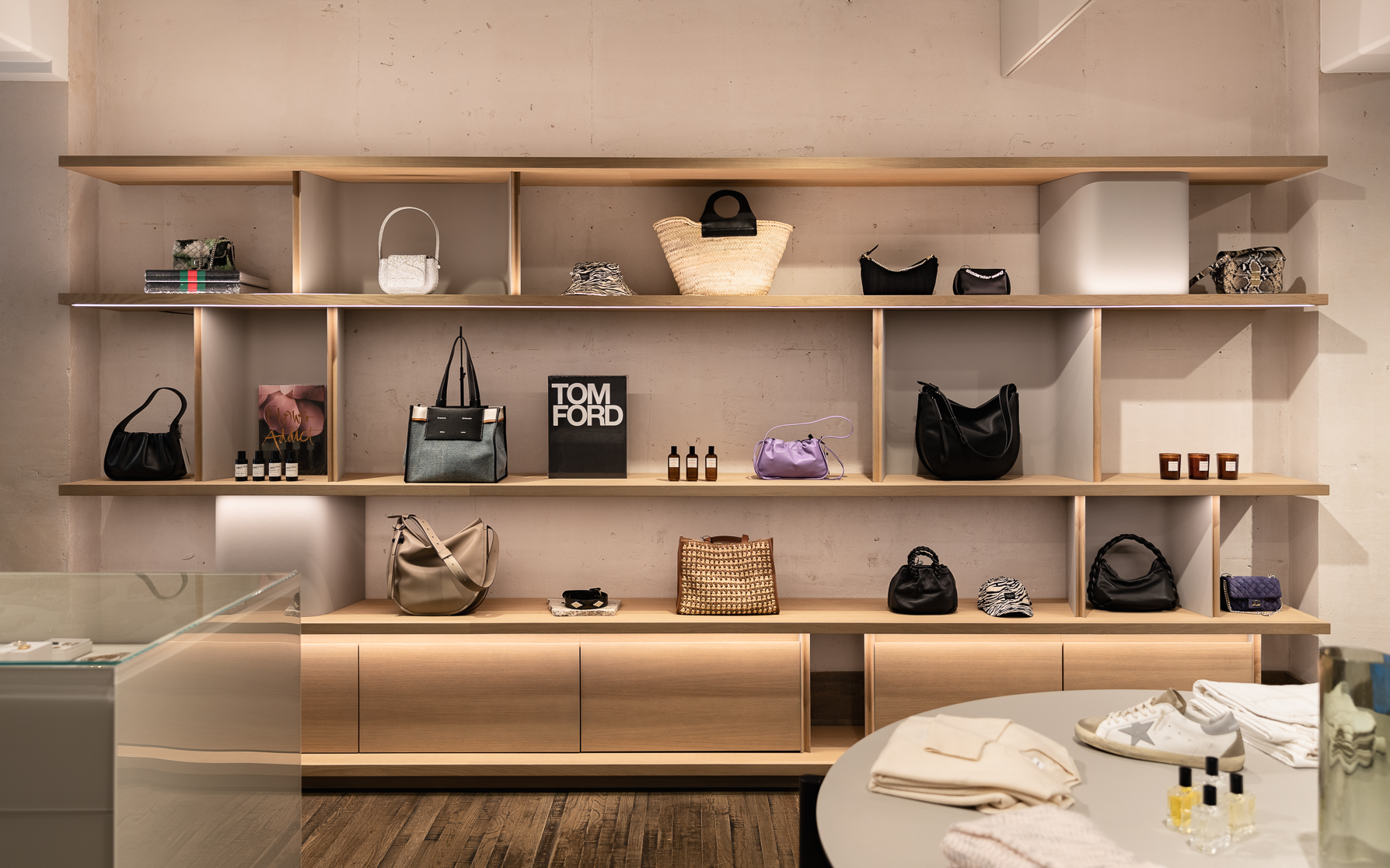 The existing warehouse site offered high ceilings and a corner facade with two windowed walls. Against the original backdrop of raw concrete and exposed beams, a contemporary material palette features warm timber walls, herringbone flooring and stainless steel panelling. This richly layered environment parallels Superette’s high-end collection.