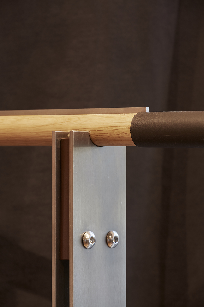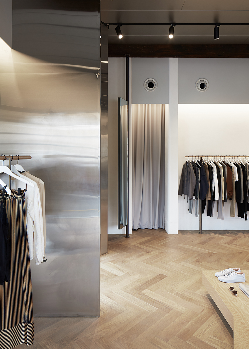 Off the main retail area, a generous customer lounge houses two fitting rooms and a timber-lined styling suite. Here, a relaxed residential feeling is achieved through soft furnishings and fabrics, enabling a more intimate experience of the apparel.