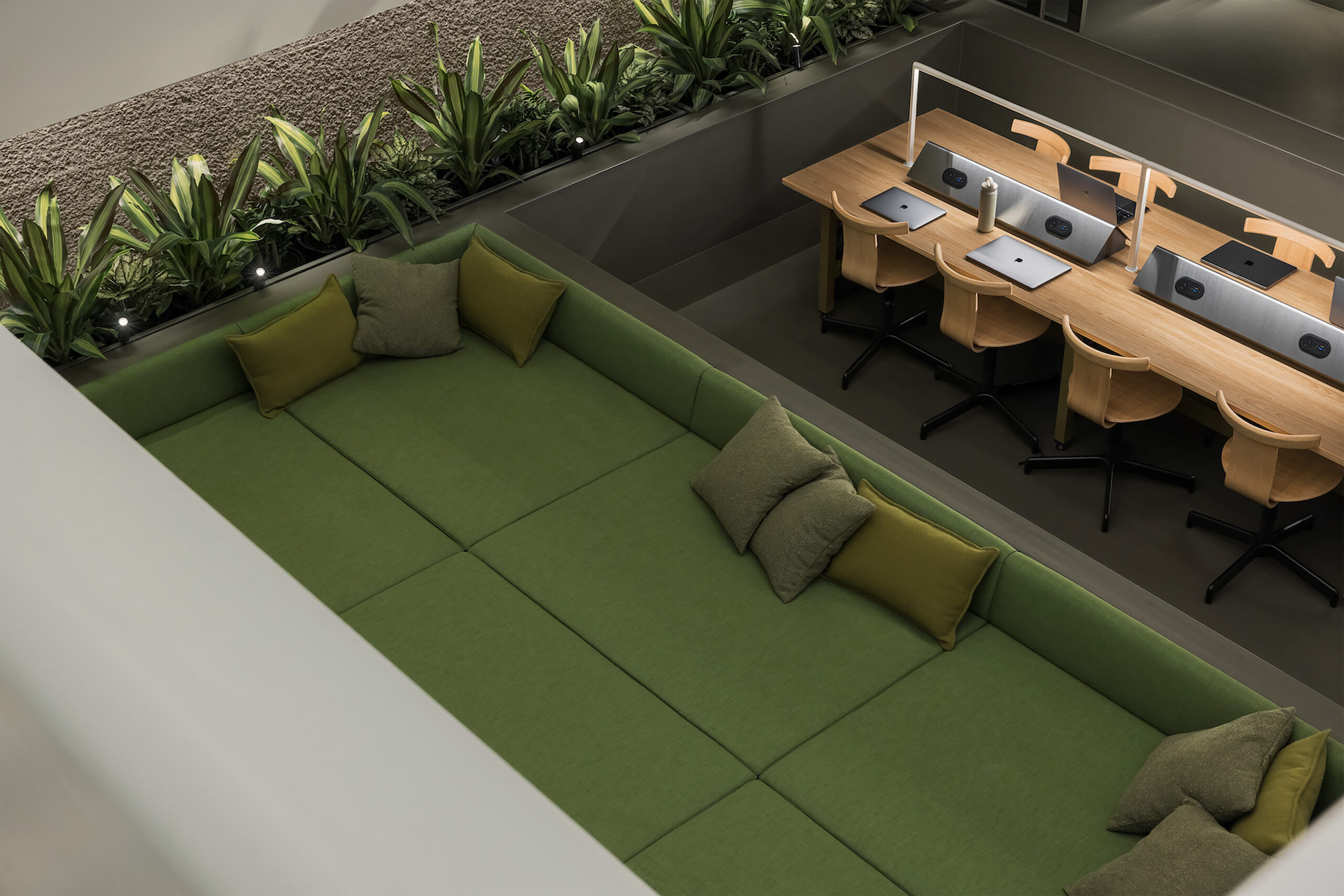 The shared workspace connects directly to the main atrium of the building anchored by the primary double height volume overlooking the Great Space and Collins Street.