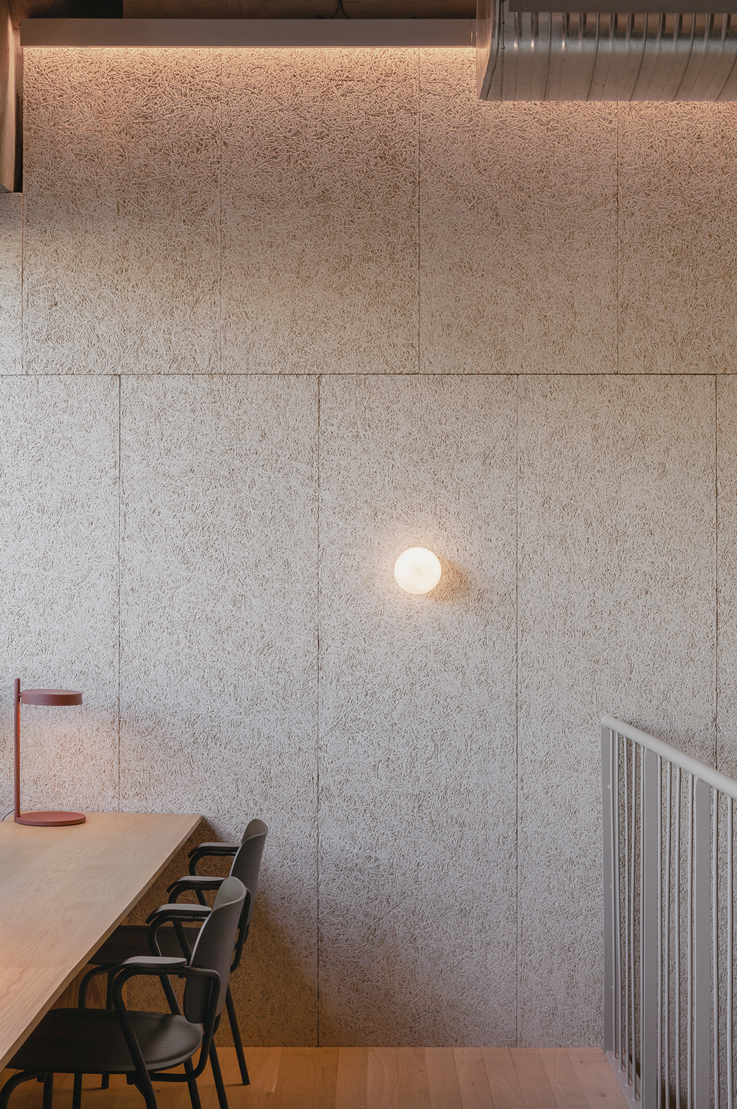 The cork clad staircase punches through the new slab opening connecting the ground floor cafe to a raised lounge, mezzanine podcast studio, sunken snug and elevated street-facing hot desks creating a dynamic spatial interplay. Communal spaces are strategically employed to facilitate the connection and collaboration that defines The Commons’ creative clientele.